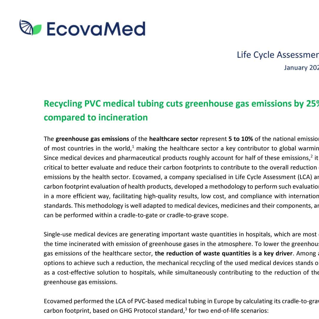 A Life Cycle Assessment (LCA) by Ecovamed shows that mechanically recycling PVC-based medical tubing – when used specifically as backing material for wall coverings with cotton embossment – results in a 25% reduction in greenhouse gas emissions compared to incineration. The cradle-to-grave study confirms a saving of 2.0 kg CO₂-equivalents per kg of tubing.